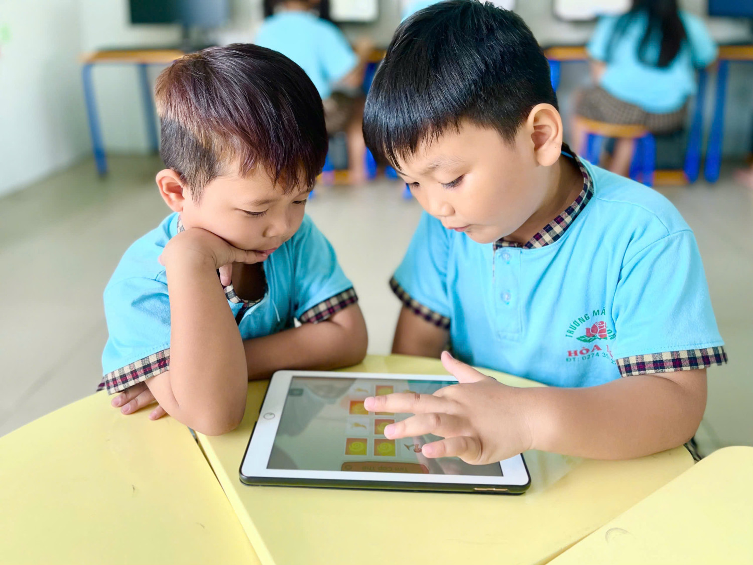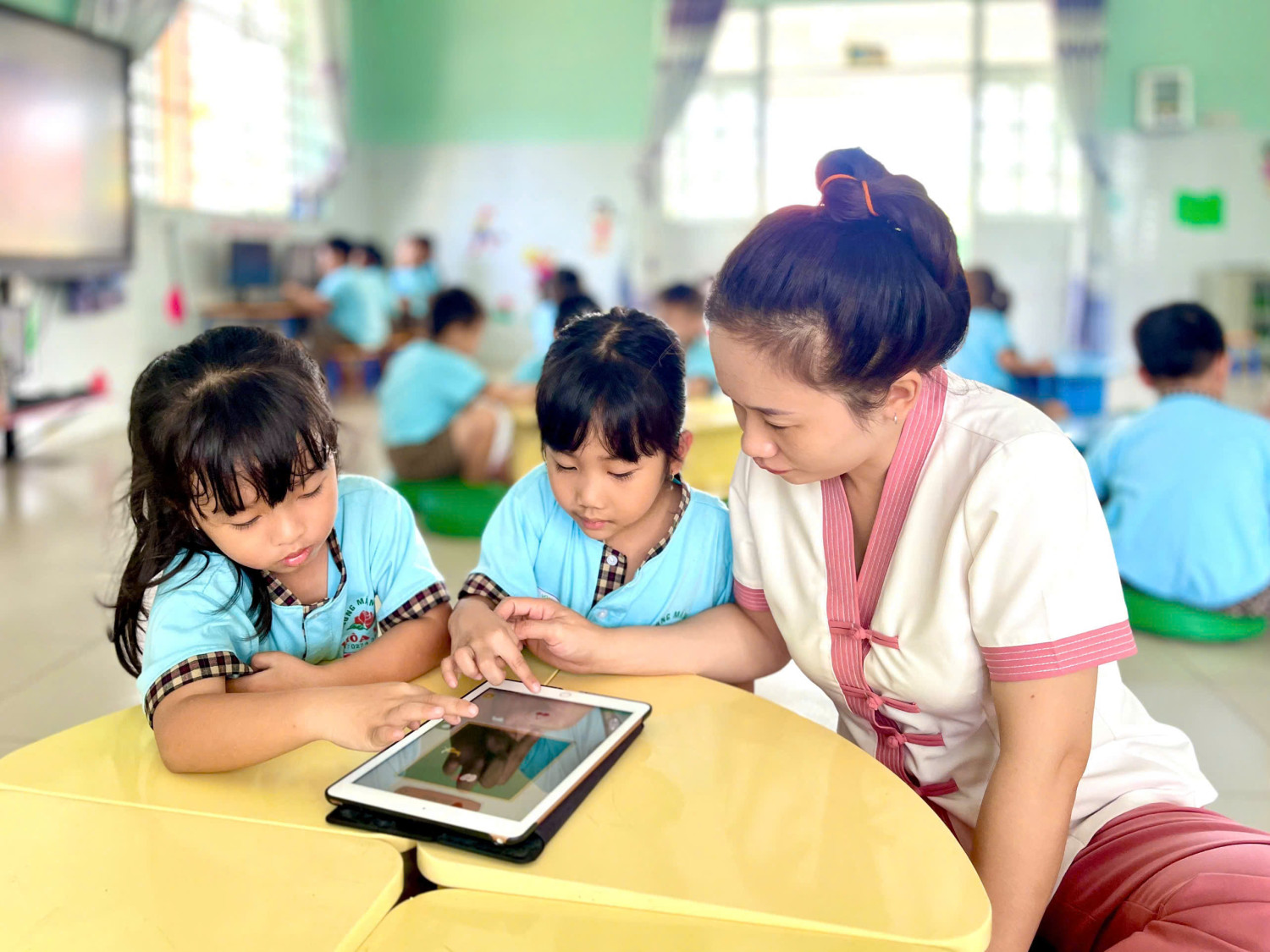 Giáo viên hướng dẫn trẻ chơi các trò chơi chữ cái trên Ipad