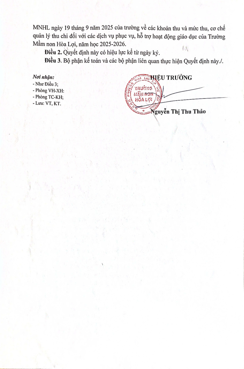 QĐ về việc công báo công khai kế hoạch các khoản thu và mức thu, cơ chế quản lý thu chi đối với các dịch vụ, hỗ trợ HĐGD của trường Mn Hòa Lợi, năm học 2025 - 2026